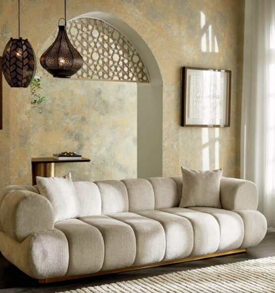 Creamy softness aur ribbed texture is sofa ko ek dreamy aesthetic dete hain. Golden base ki subtle glow usay classy aur standout furniture piece banati hai.