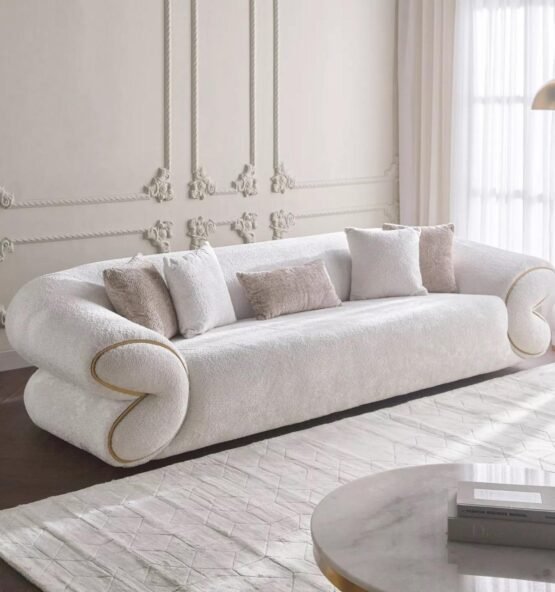 Ribbed fabric aur soft padding ke sath ye sofa elegance aur coziness dono offer karta hai. Golden base ka luxurious charm usay ek statement piece bana deta hai.