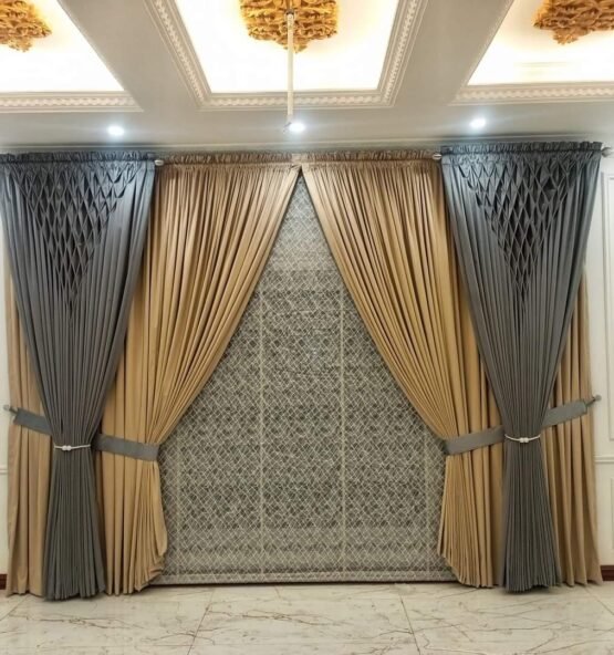 Dual-shade combination aur refined weaving ke sath ye curtain ghar ko ek balanced aur grand look deta hai.