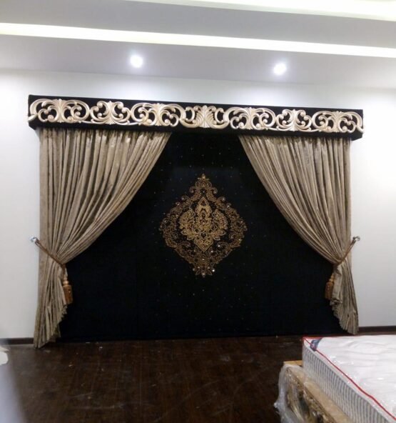 Soft golden drapes aur bold grey weave ka elegant fusion, jo har room ko classy aur luxury touch deta hai. Contemporary aur traditional décor dono ke liye perfect.