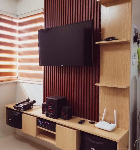 Premium wooden texture aur neutral cabinets ke sath, ye media wall luxury aur simplicity ka ek naya standard set karti hai.