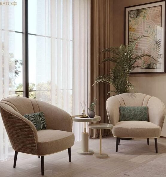 Warm velvet tones aur elegant shell back design isay cozy banate hain. Golden legs modern chic style add karte hain.