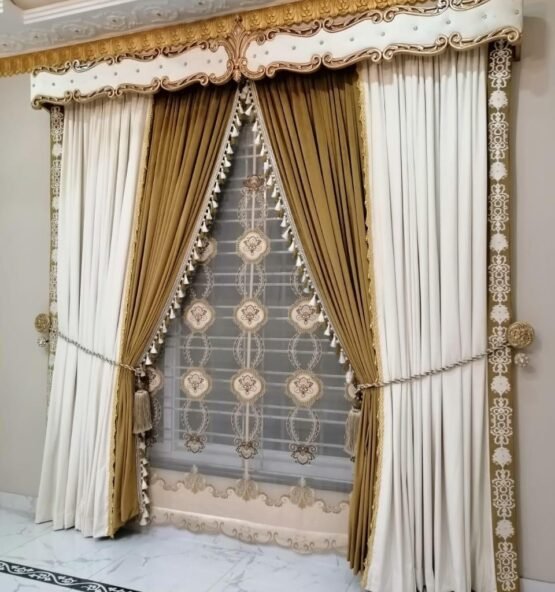 Golden tone curtains sunlight ke sath ek bright aur airy vibe banate hain. White sheers ki softness is design ko modern aur classy touch deti hai.