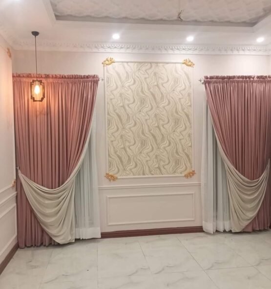 Golden shine aur charcoal grey ka fusion is curtain ko classy aur timeless design banata hai. Drawing aur living room dono ke liye perfect.