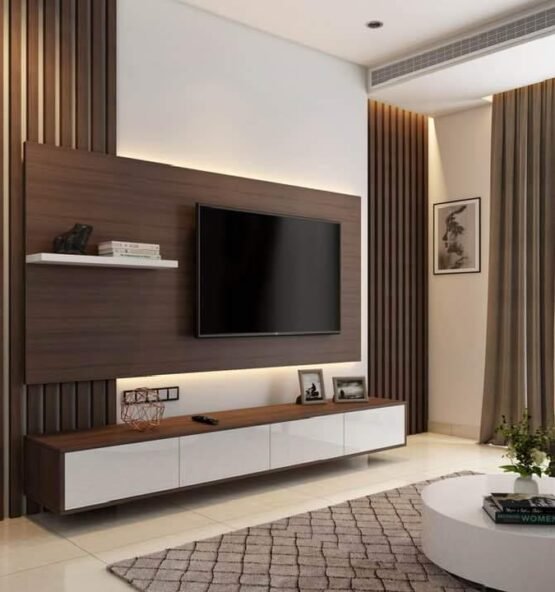 Warm tones aur modern shelving ke sath ye media wall living room ko ek organized aur luxury feel deta hai.