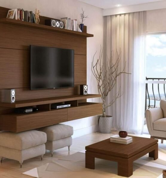Vertical wooden strips aur subtle finish ke sath ye wall living space ko spacious aur luxury look deti hai.